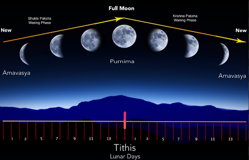 Lunar day (Tithi in Sanskrit) is a slight moment of moon 12 degrees until it’s fully visible aka Purnima “the full moon night”.